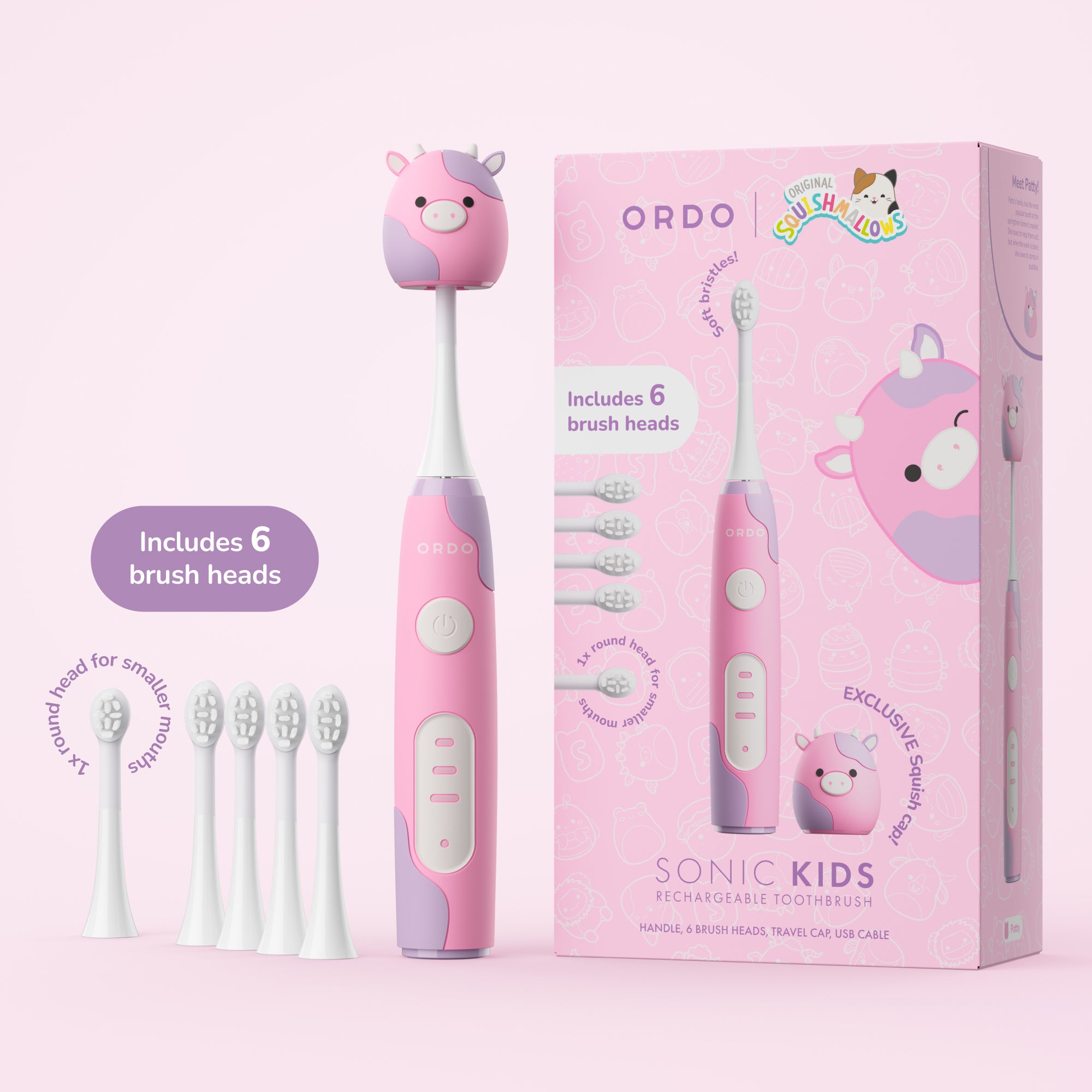 Ordo Sonic Kids Rechargeable Toothbrush & 4x Brush Heads - White - Squishmallows Patty