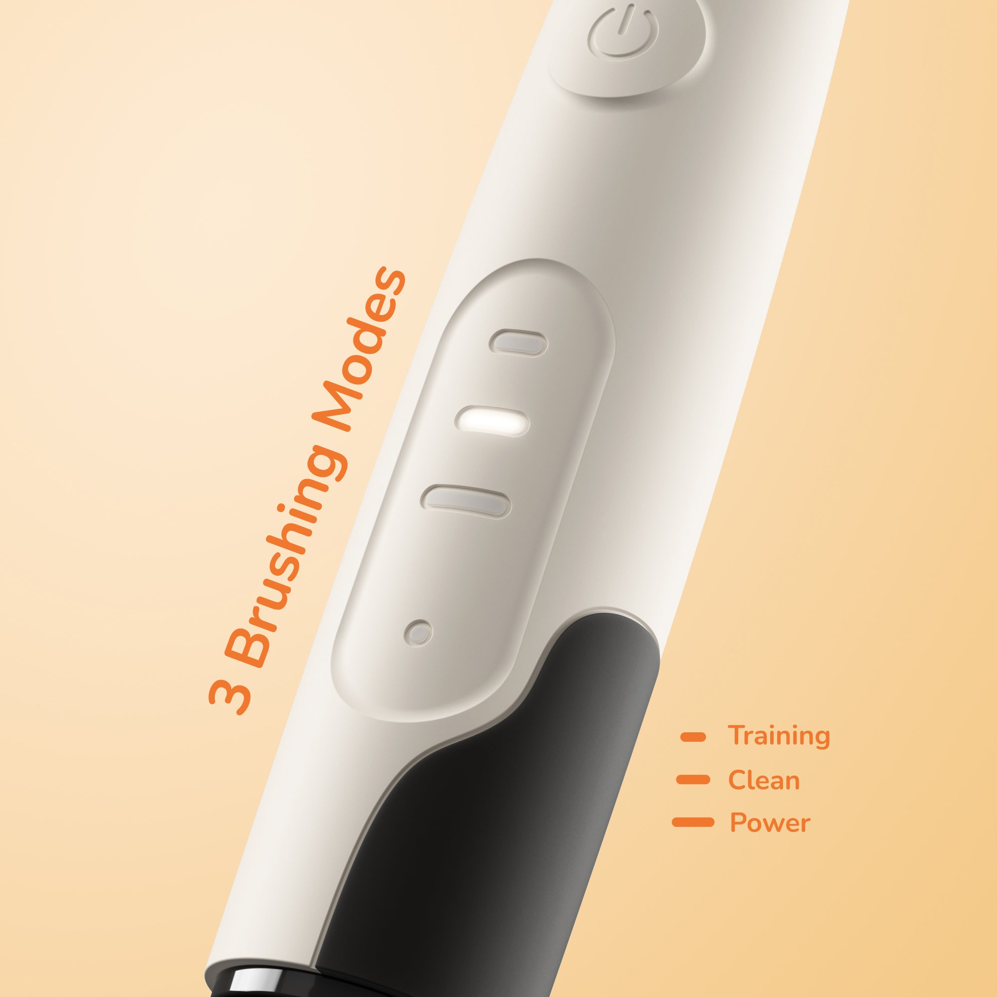 The toothbrush offers three modes: Training Mode for younger kids and beginners, Clean Mode for everyday use, and Power Mode for a deeper clean suitable for older kids and teens.