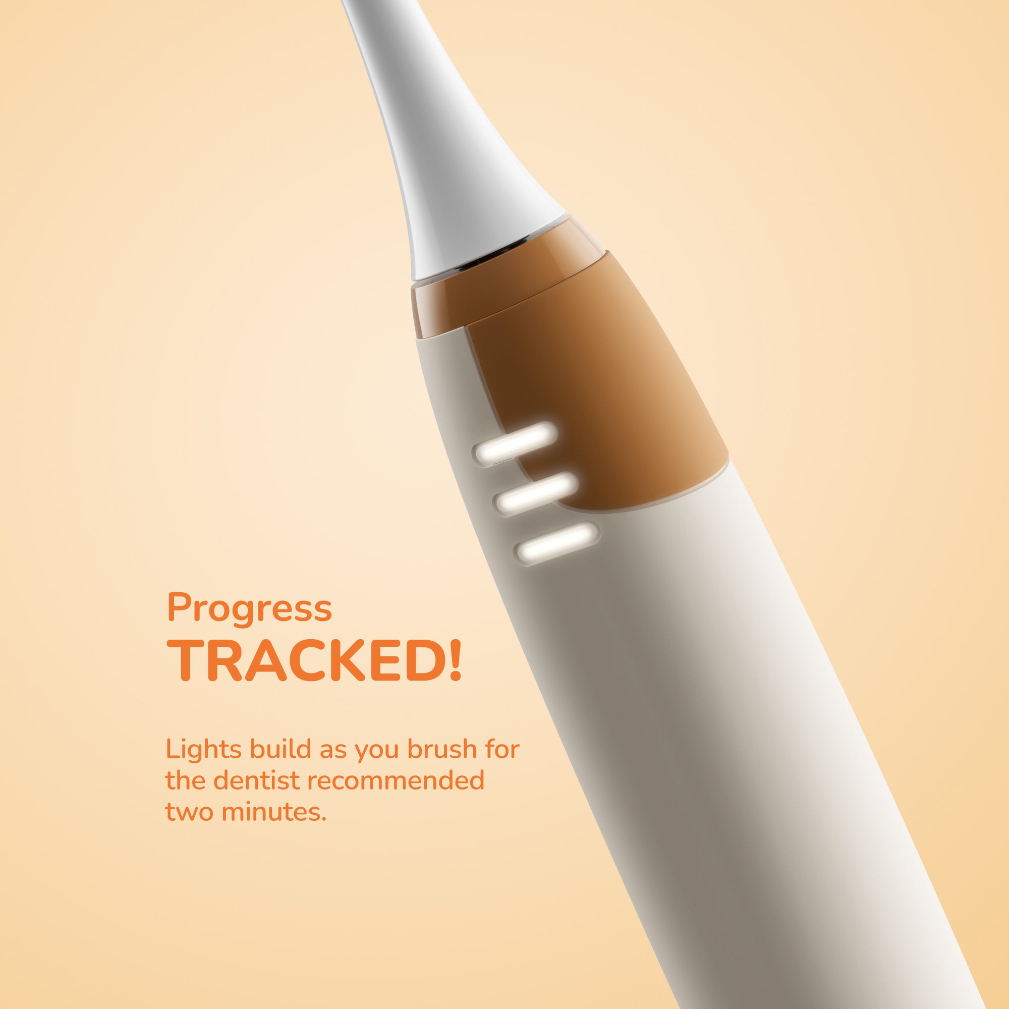 Progress lights build every thirty seconds to help track brushing for the dentist-recommended two minutes.