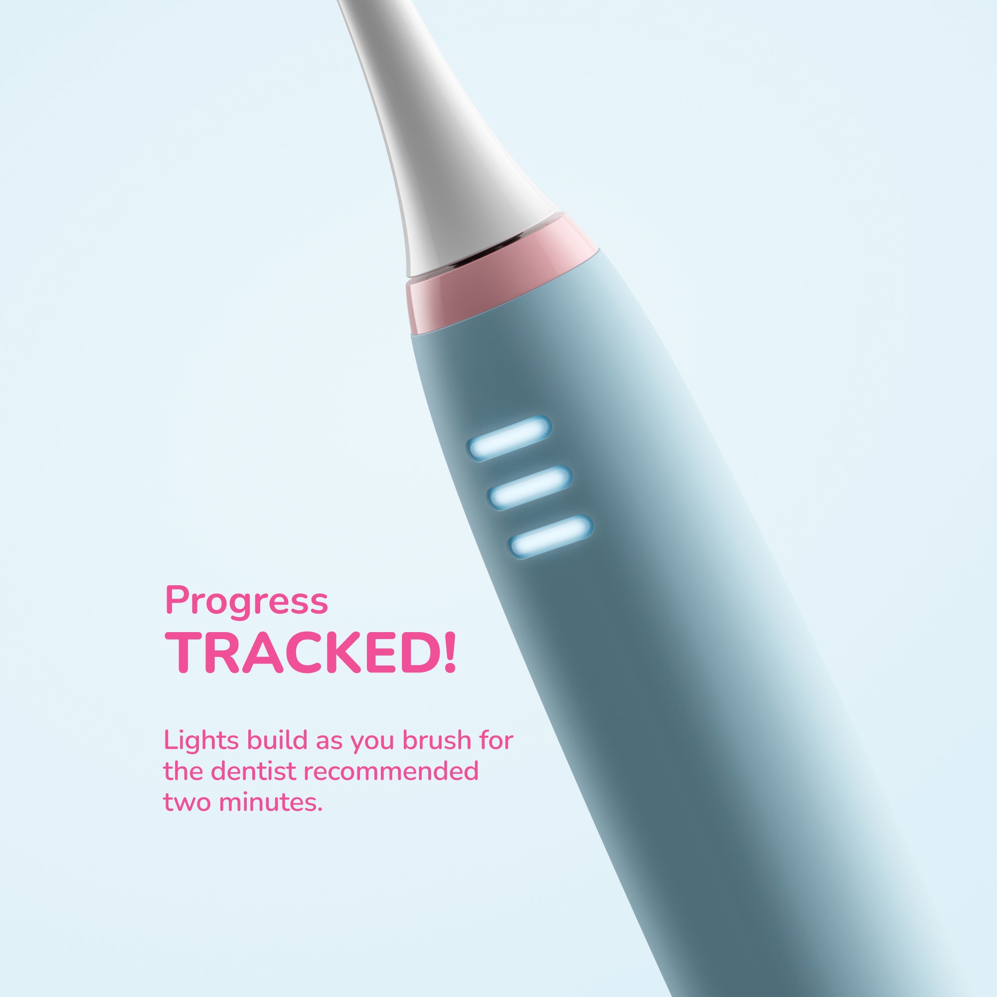 The progress tracker uses audio and haptic feedback, along with progress lights, to guide better brushing. Every 30 seconds a new light illuminates and they all flash in succession after two minutes to indicate that the recommended brushing time is complete.